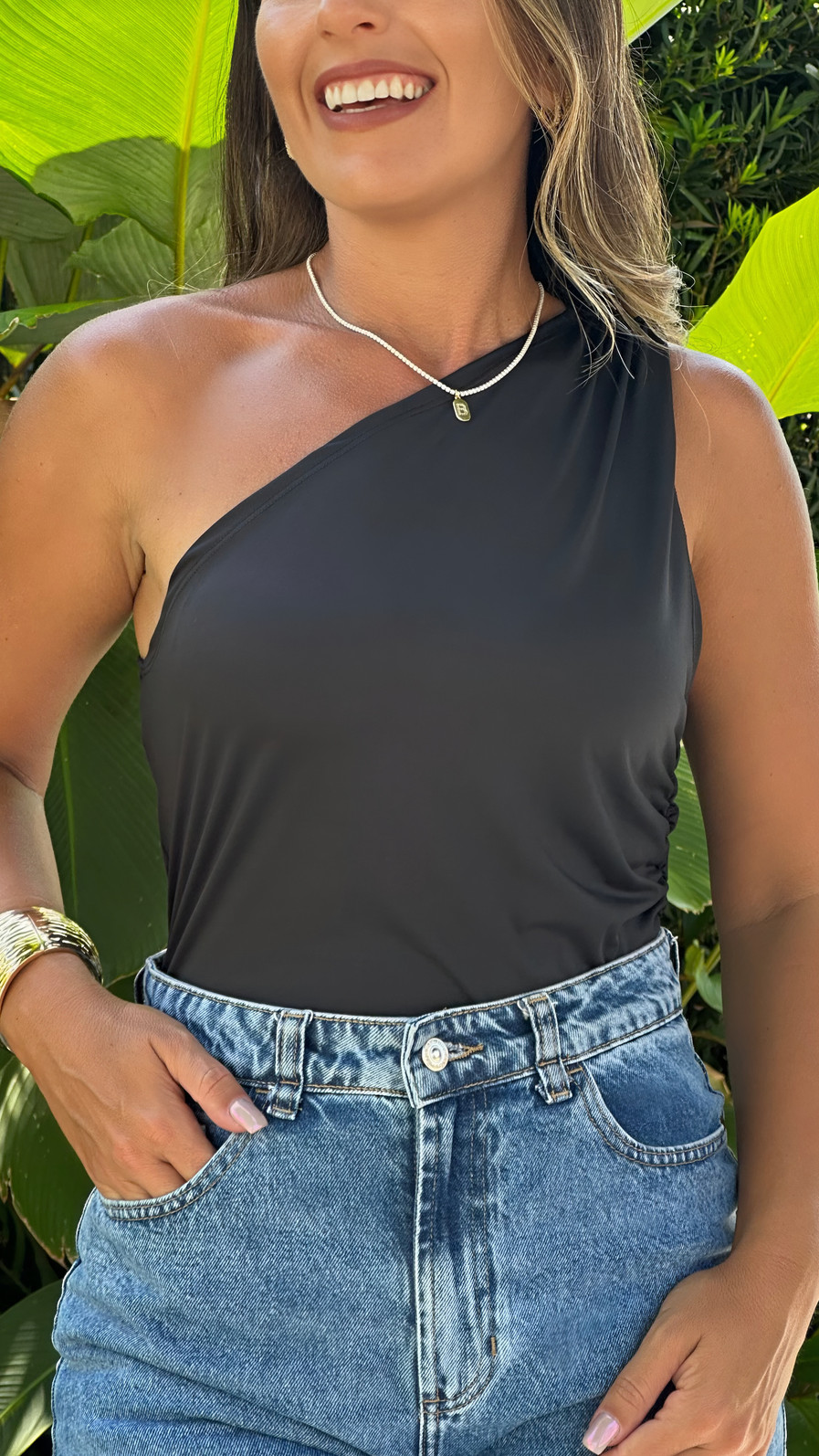 Com design assimétrico, ombro único e franzido estratégico, essa peça valoriza o corpo e traz um visual moderno e sofisticado, perfeita para looks do dia à noite.