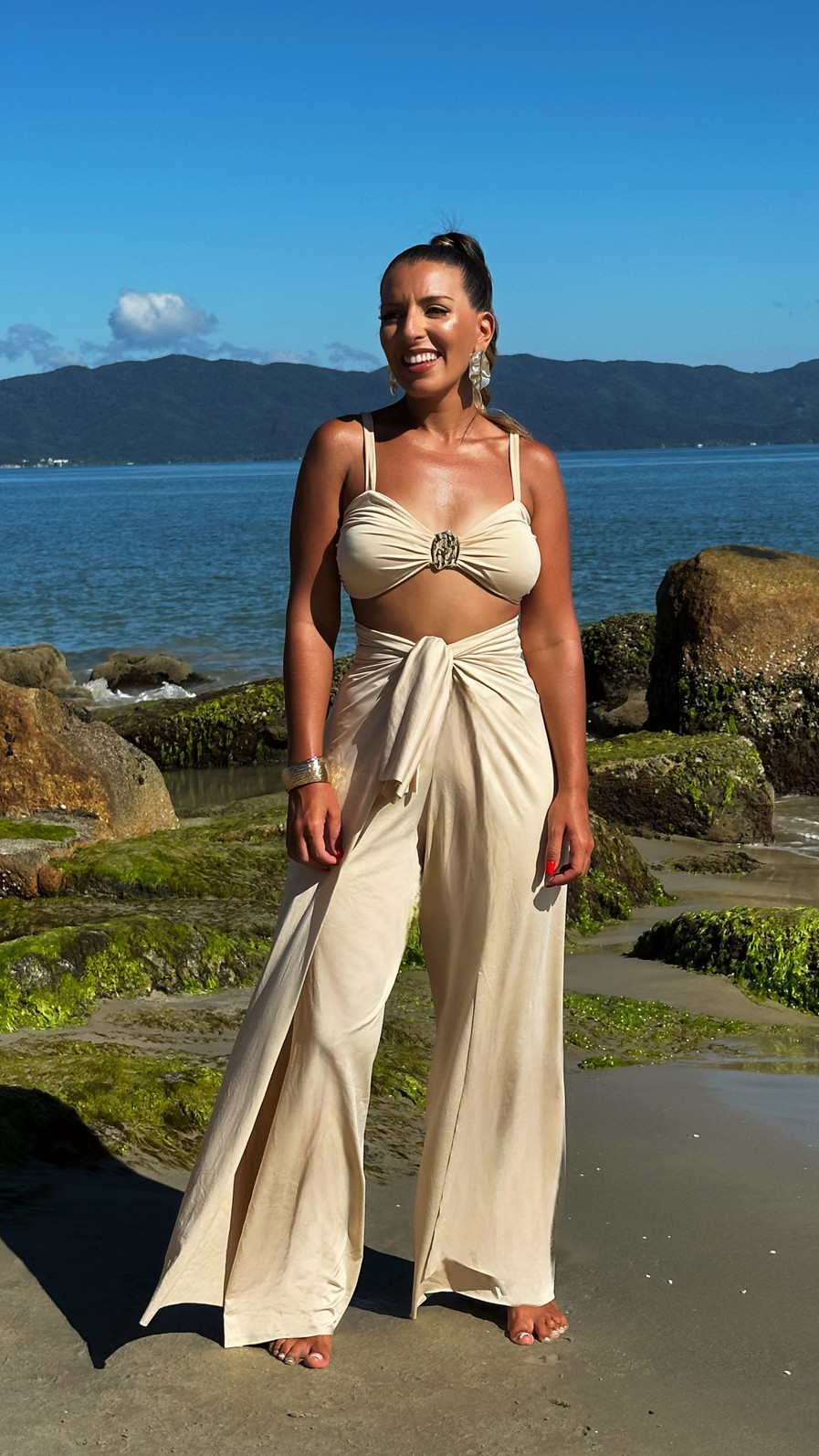 O top traz um toque especial de design. Ele possui alças com ajuste, que permitem adaptar melhor ao corpo, e uma fivela orgânica super charmosa, que adiciona um brilho elegante e um detalhe sofisticado à peça. Nas costas, o laço para amarração permite ajustar o caimento e ainda cria um visual delicado.