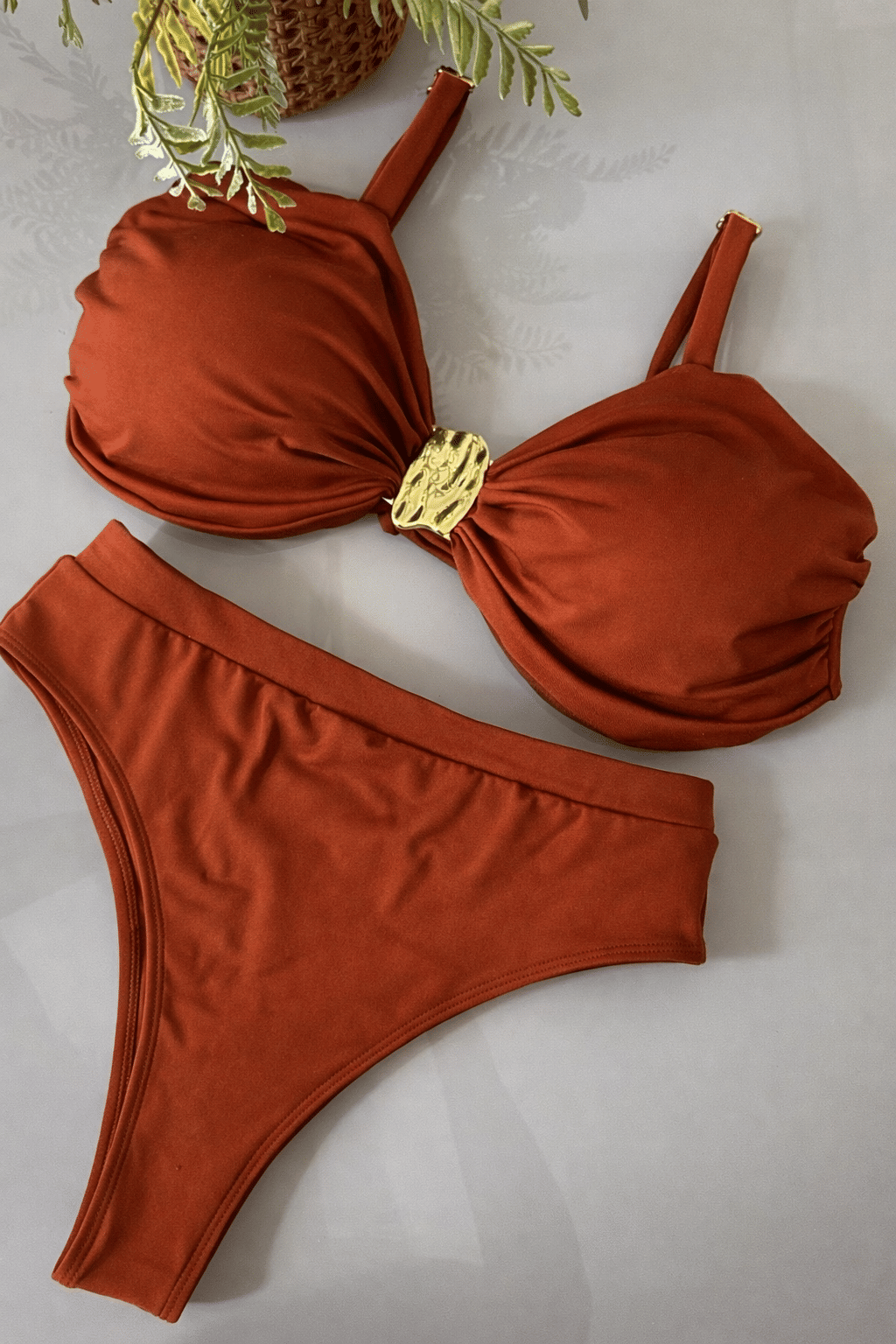 O top traz um toque especial de design. Ele possui alças com ajuste, que permitem adaptar melhor ao corpo, e uma fivela orgânica super charmosa, que adiciona um brilho elegante e um detalhe sofisticado à peça. Nas costas, o laço para amarração permite ajustar o caimento e ainda cria um visual delicado.