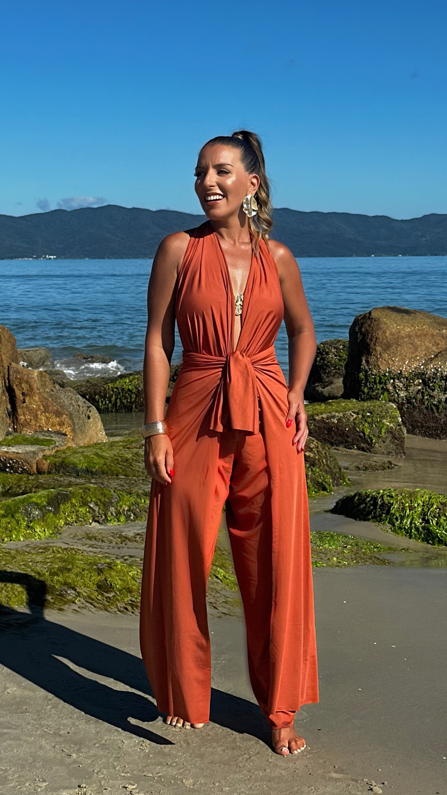 A calça macacão é aquela peça que se transforma com você. Com diversas formas de uso, ela pode ser usada como macacão, calça pantalona, frente única, um ombro só e muitas outras amarrações. Feita em malha fria com elastano, tem caimento leve, fluido e confortável perfeita para acompanhar você da praia ao passeio.