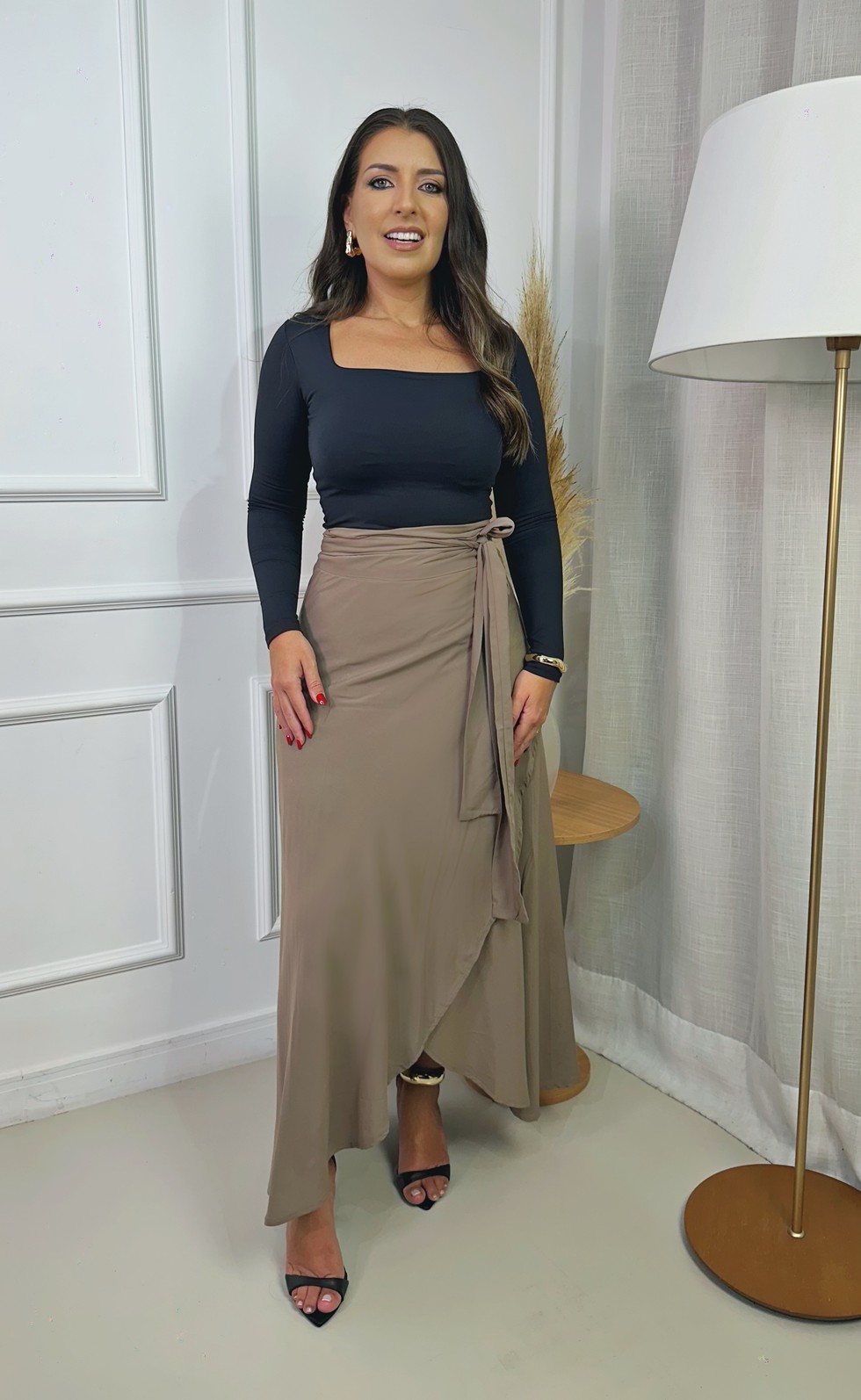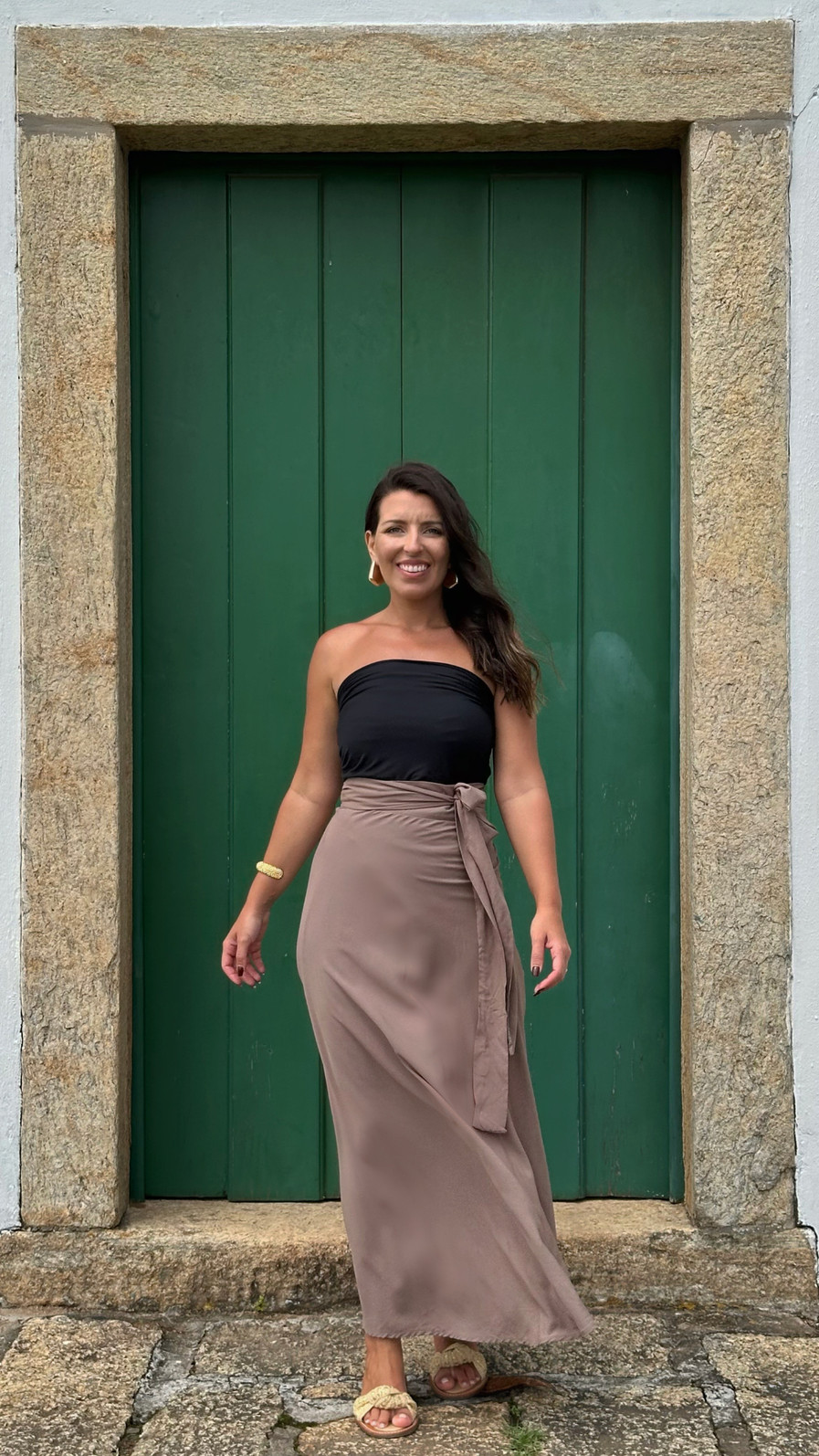 Uma peça que se transforma junto com o seu dia, seu estilo e o clima. Pode ser usada como saia longa elegante ou em diferentes modelos de vestido, se adaptando ao seu corpo e à sua rotina com praticidade e charme.